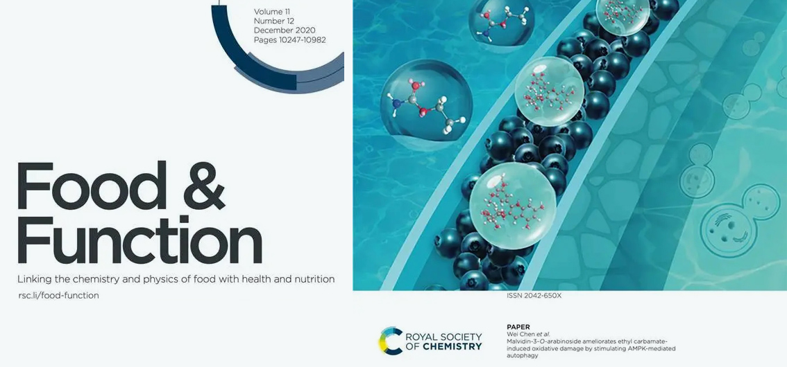 近期,在英國皇家化學(xué)學(xué)會(huì)出版的國際食品期刊《Food & Function》上發(fā)表了題為“Malvidin-3-O-arabinoside ameliorates ethyl carbamate-induced oxidative damage by stimulating AMPK-mediated autophagy”的研究論文。研究表明,氨基甲酸乙酯(Ethyl Carbamate, EC)是發(fā)酵食品中常見的化學(xué)污染物,國際癌癥研究機(jī)構(gòu)(IARC)將EC列為2A類致癌物。然而目前有關(guān)EC引發(fā)腸道毒性和潛在的防控方法鮮有報(bào)道。因此,深入開展EC的毒性機(jī)理研究,挖掘安全有效的食源性功能因子,對(duì)防控EC誘導(dǎo)的毒性及改善國民健康水平具有重要意義。