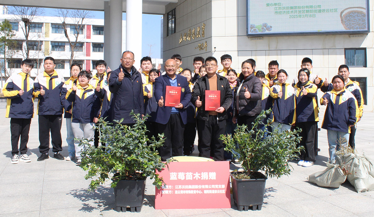 3月18日,在“黨建+公益”引領下,一場溫暖人心的愛心捐贈活動在連云港市特殊教育中心隆重舉行。本次活動是由江蘇連云港經濟技術開發區朝陽街道依云社區與江蘇沃田集團股份有限公司黨支部共同攜手,現場為市特殊教育中心的孩子們捐贈了100株藍莓苗。依云社區黨支部書記、主任伏保,沃田集團副總裁、集團黨支部書記李松松,集團董事會秘書孫子然,市特教中心黨總支書記黃勇,副書記朱敏,副校長程小兵以及老師和學生代表等近30余人參加活動。